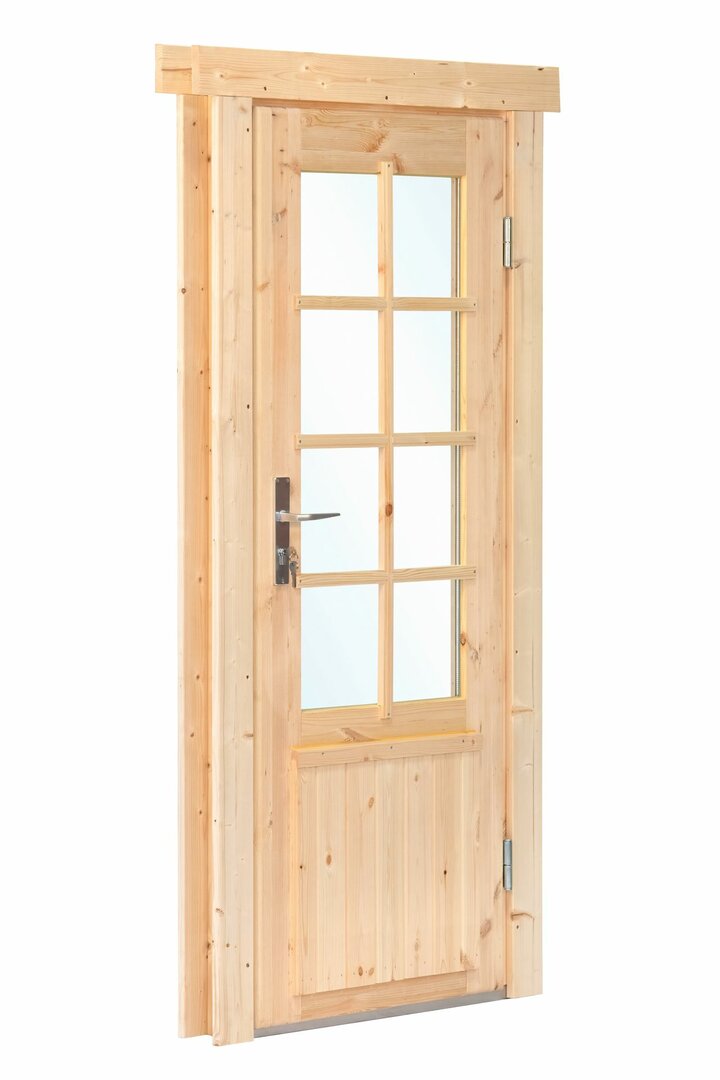 Deze onbehandelde vuren enkele deur met raam DL11 biedt een praktische en kwalitatieve toegang voor uw verblijf, met een buitenwerkse kozijnmaat van 90,5 x 196,0 cm. De deur is ontworpen met het oog op comfort en isolatie; het deurpaneel is aan beide kanten met hout bekleed met daartussen hoogwaardig isolatiemateriaal. Voor de beglazing is gekozen voor 4-6-4 mm isolatieglas, wat bijdraagt aan een goede thermische afsluiting.
