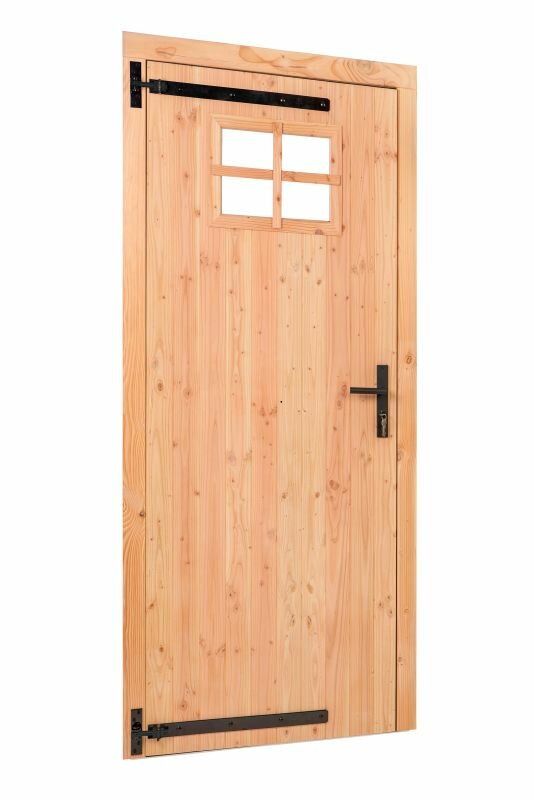 Deze onbehandelde Douglas enkele deur is een robuuste en stijlvolle entree voor uw buitenverblijf, met een buitenwerkse kozijnmaat van 100,0 x 205,0 cm. De deur heeft een stevige dikte van 4,5 cm en is voorzien van een elegant klein raam met 4 mm enkel glas. Dankzij de meegeleverde losse roedes kunt u het raampje naar eigen smaak voorzien van een klassieke vakverdeling.